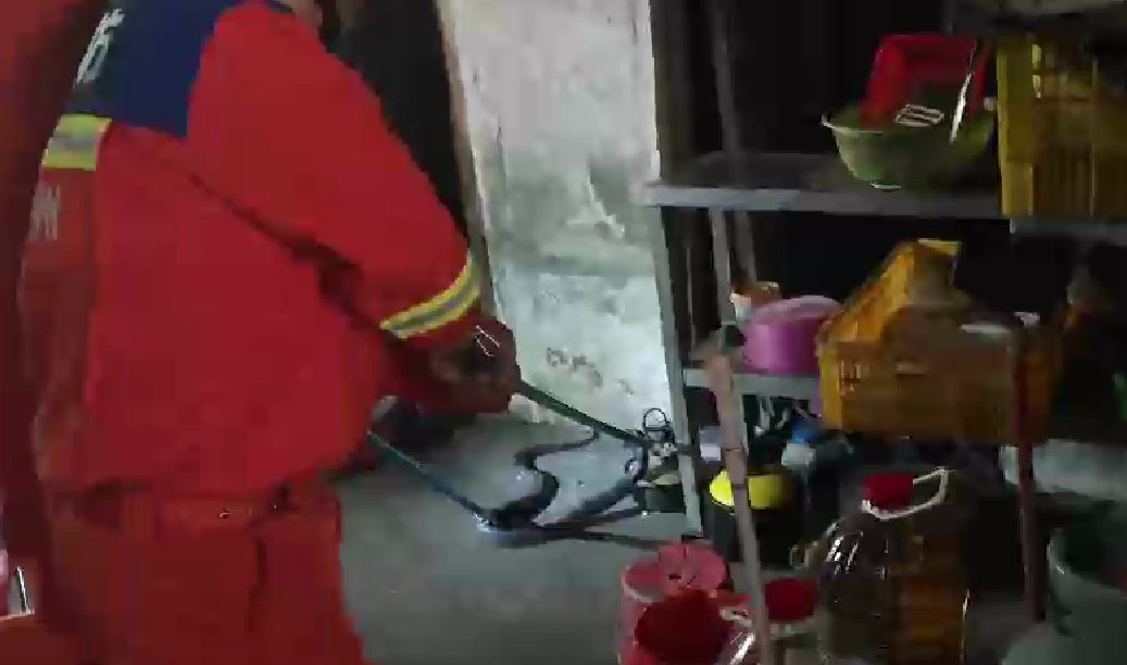 消防员到场后,迅速在养鸡场内找到“非法闯入”的眼镜蛇,瞅准时机,一把按住蛇头,成功将其捕获。