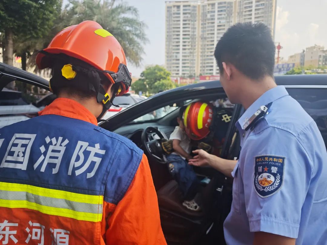 7月7日下午5时许,广东省河源市区建设大道与中山大道交会处附近,一名3岁男童被困车内。当时天气炎热,密闭车厢内温度骤升,情况十分紧急。接警后,辖区消防救援力量立即赶赴现场救援。