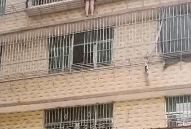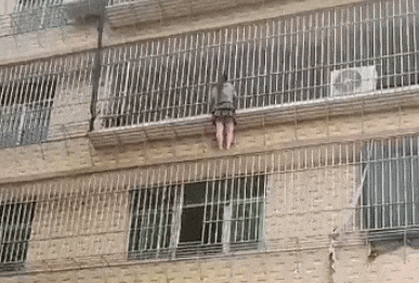 翻过三楼防盗窗站在外部栏杆上
