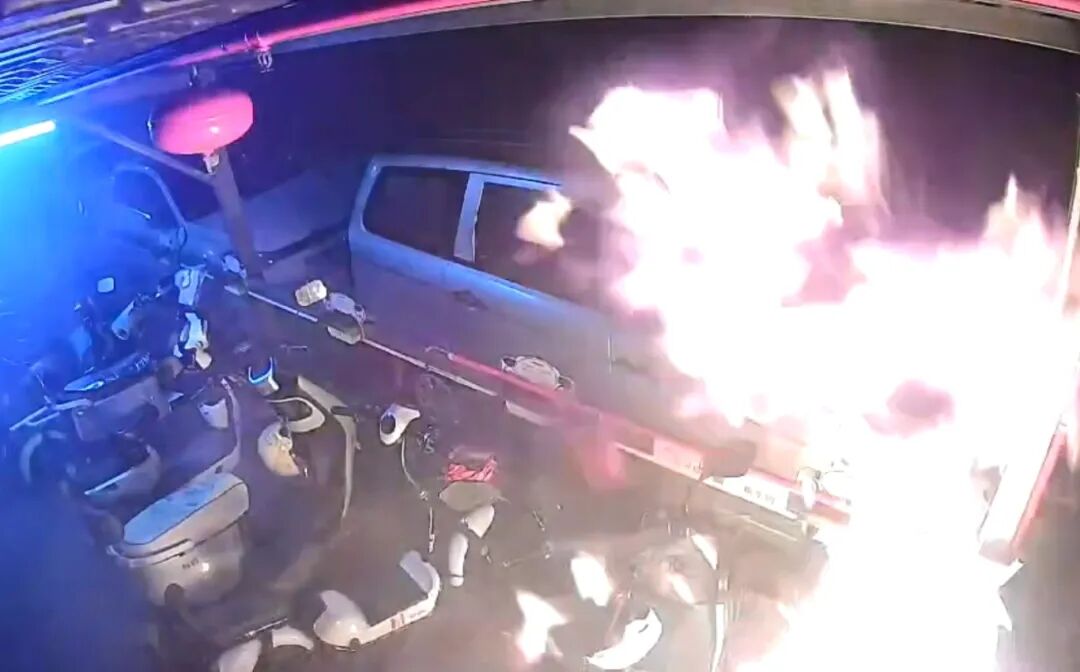 监控画面所示,当天0时47分,停放在电动自行车车棚的一辆电动自行车突然冒烟自燃,火势迅速蔓延,引燃了相邻的一辆面包车和另一辆电动自行车。着火后,车棚内的消防喷淋迅速发挥作用,避免火势蔓延。物业保安发现火灾后第一时间报警,并使用干粉灭火器压制火势,利用火钩等工具将着火车辆拖到安全地带,在消防部门到场前成功将明火扑灭。