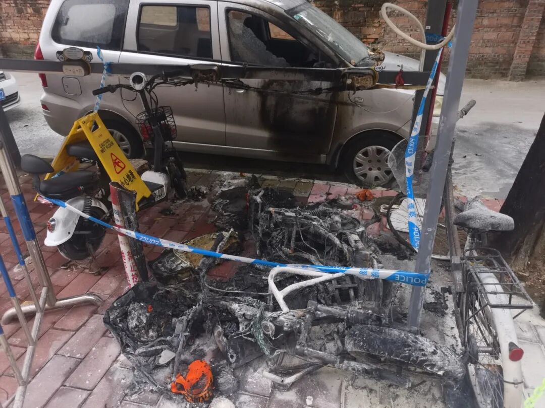 此次火灾导致涉事电动自行车被烧毁,并波及附近一辆面包车及另一辆电动自行车,所幸并未造成人员伤亡。