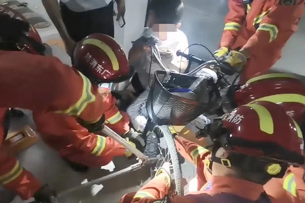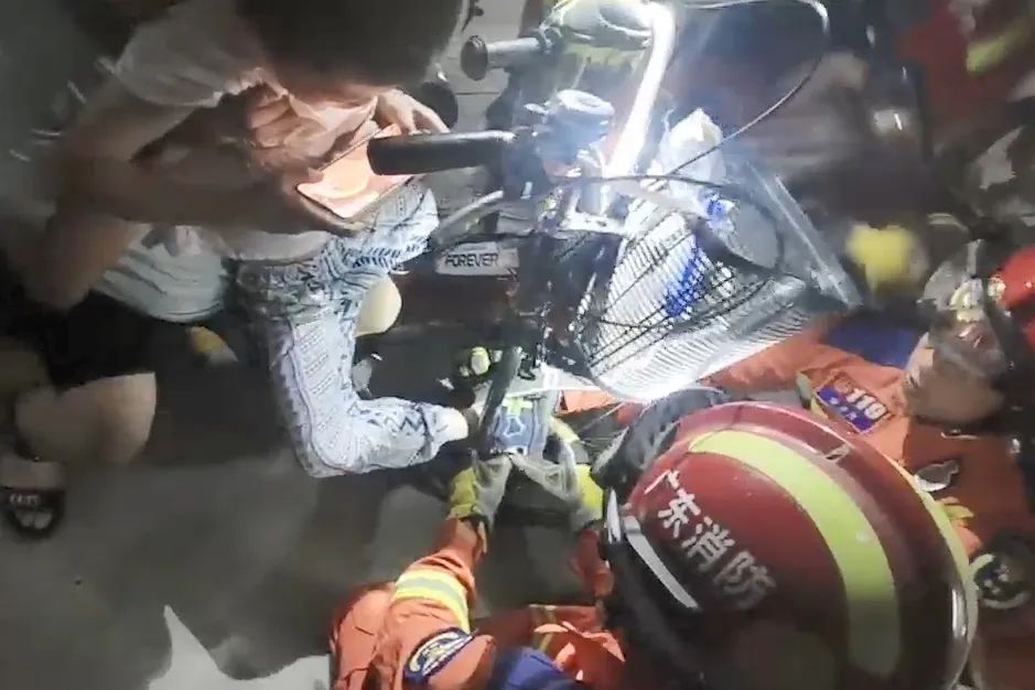 8月19日下午,中山市石岐街道某住宅小区地下车库发生一起意外事故:一名男孩在骑自行车时,右腿脚部不慎被前轮卡住,无法自行脱困,家长发现后立即报警求助。