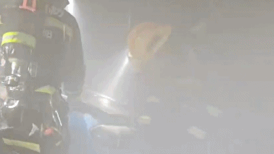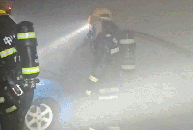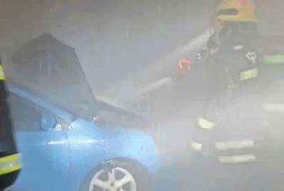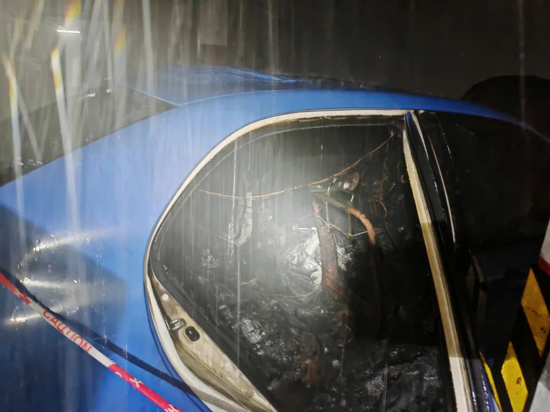 消防员到场后发现,涉事轿车所停放的小区地下车库内浓烟弥漫,轿车起火部位为发动机,车头已被烧至变形,发动机舱及驾驶室损毁严重,仅剩框架结构。