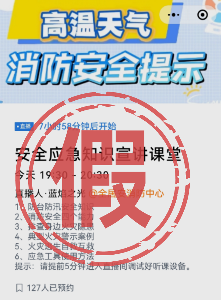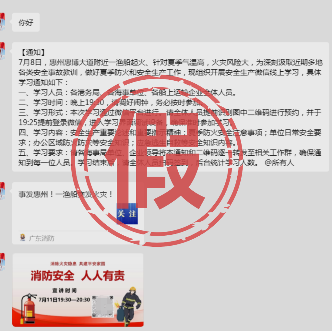 消防救援部门接到部分单位反映,有不法机构通过电话、短信等形式,称做好夏季防火和安全生产工作,将组织开展安全生产微信线上学习。