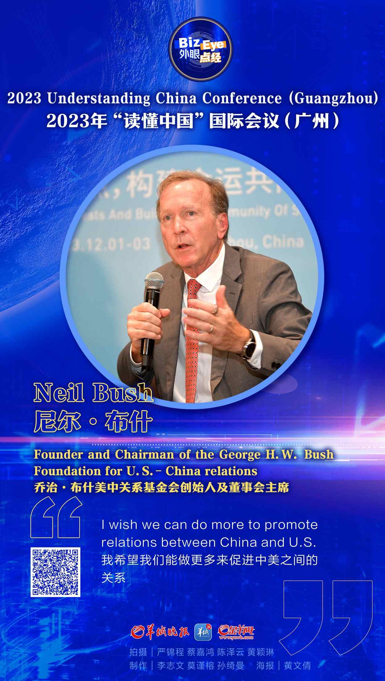How to understand China? How to see Guangdong's role in global trade? From December 1st to 3rd, the 2023 Understanding China Conference is being held in Guangzhou, bringing global politicians and experts together. We took an opportunity to visit Neil Bush,Founder and Chairman of the George H.W. Bush Foundation for U.S.- China relations,to hear his opinions about China.