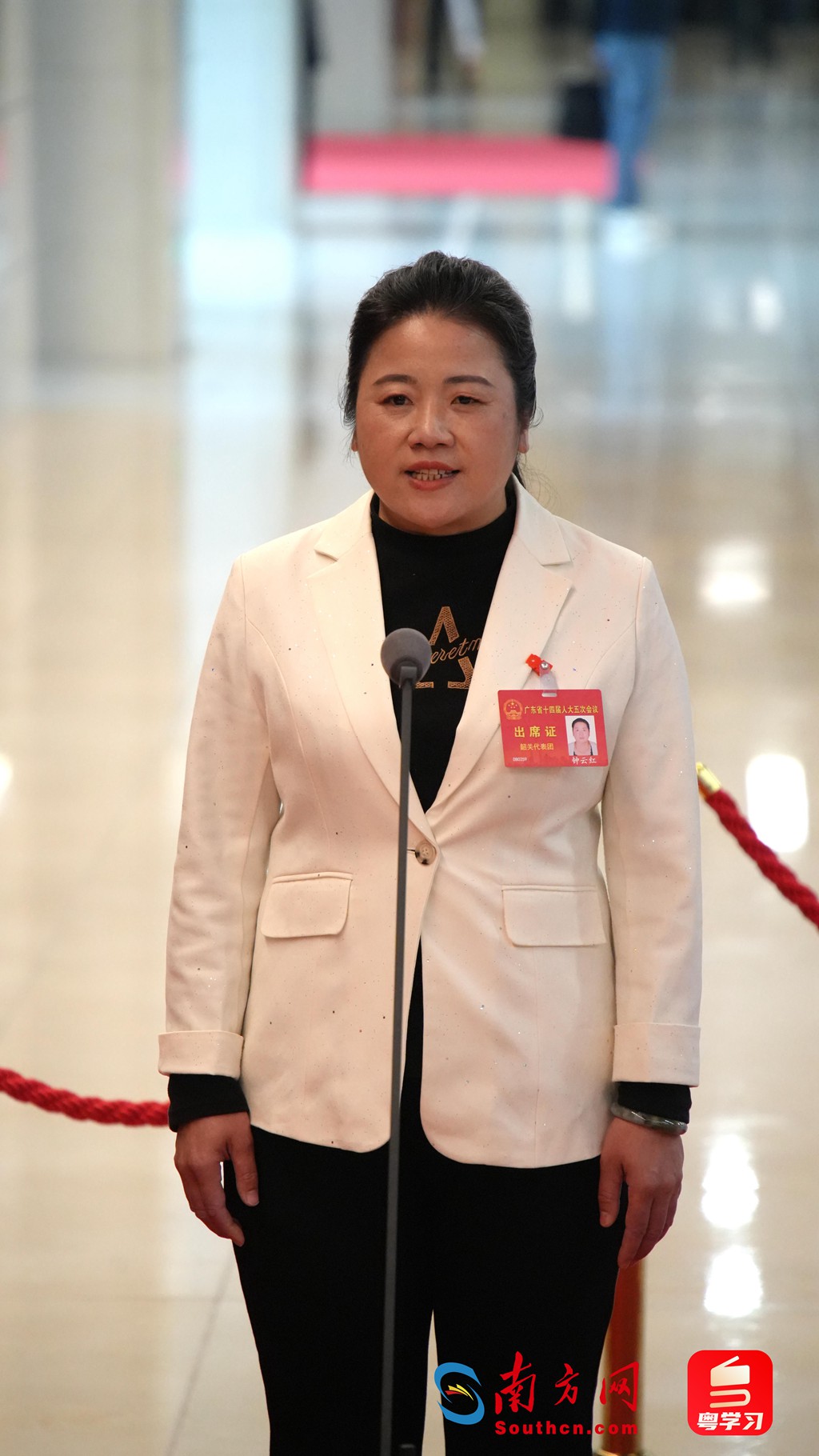 1月26日,广东省人大代表,韶关南雄市邓坊镇马战村党支部书记、村委会主任、经联社负责人钟云红在广东省十四届人大五次会议“代表通道”上接受记者采访,介绍马战村完成“土地生金、村民致富、乡村和美”华丽转身的背后故事。