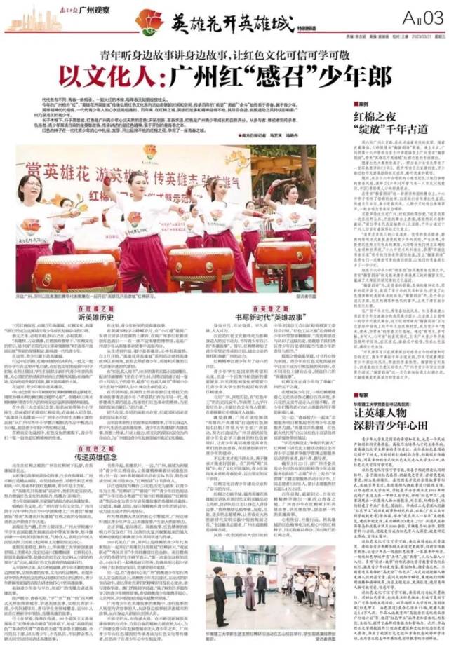 今年的广州格外“红”。“英雄花开英雄城”传承弘扬红色文化系列活动串联起时间和空间,传承百年的“希望”“勇敢”“奋斗”始终系于青春、属于青少年。