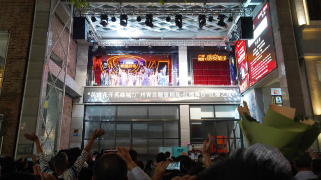 周六的广州北京路,处处洋溢着欢快的氛围。随着夜幕降临,人群慢慢向“橱窗剧场”聚集。晚上8点,广州市第十六中学作为首个中学团体登上广州青宫“橱窗剧场”,带来“英雄花开英雄城”红棉之夜的专场演出。