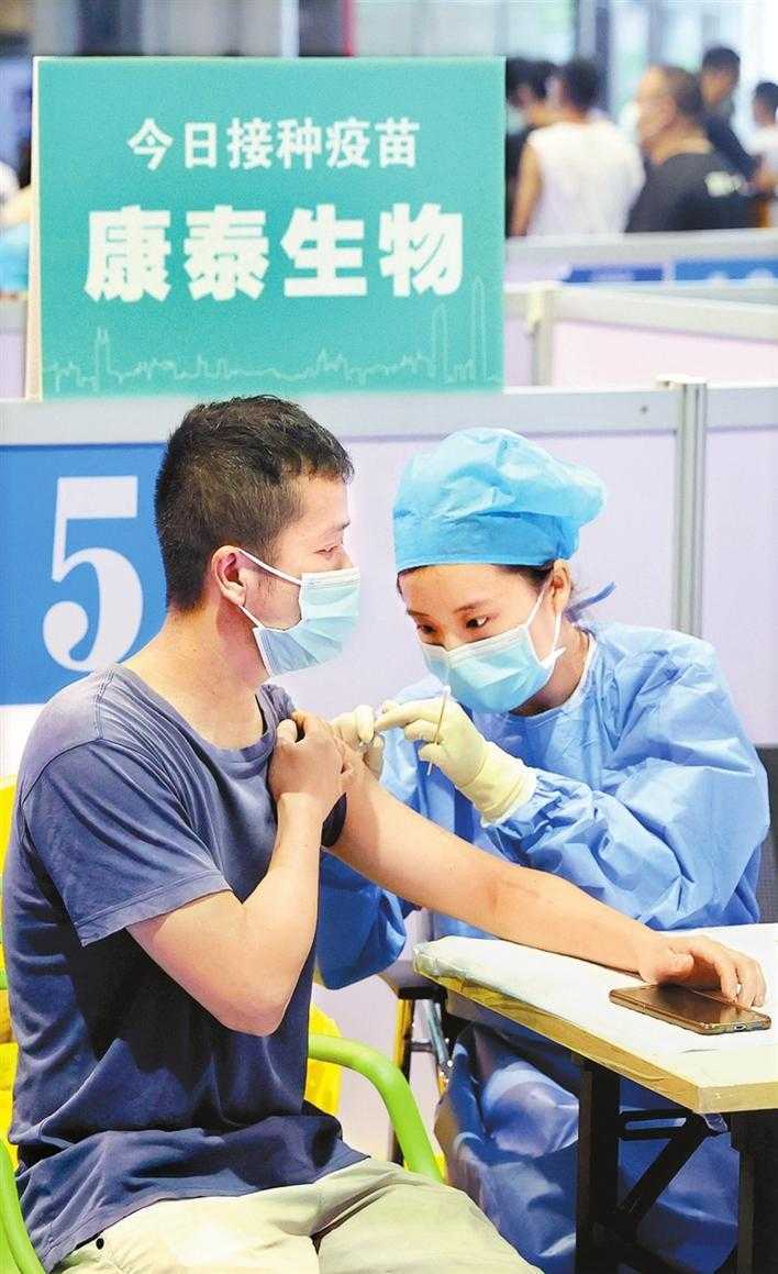 记者6月1日在深圳湾体育中心疫苗接种点看到,康泰生物董事长杜伟民带头接种自家企业生产的疫苗,向市民传递信心。据介绍,康泰生物研发的“可维克”新冠疫苗为灭活疫苗,5月14日获国家药监局批准在国内紧急使用。该疫苗是广东省首个获批紧急使用并启动接种的新冠疫苗,需要打2针。目前首批52万支康泰疫苗在深圳接种,今后将推广至广东其他地市和全国各地。