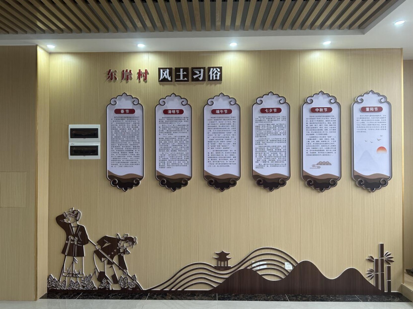 村史馆内陈列着东岸村村民历代使用的传统农耕工具,包括犁、耙、锄、镰等耕地、收割工具,以及竹编谷箩、簸箕等晾晒、储存农具。这些工具由村民自发捐赠,部分至今仍在使用,见证了东岸村从传统农耕向多元发展的变迁,承载着村民对土地的敬畏与依赖,也留存着东岸人世代的生活记忆。