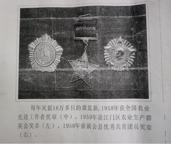 这项荣誉的获得让谭其新感到无比自豪,也给了他奋进的无限力量。从北京回来后,他更加努力做好本职工作,一边捕鼠,一边带领群众抓农业生产。在1959年至1963年期间,他先后担任了英南大队党支委、民兵营长、青年突击队队长,他积极发动青年入团、入党,带头拆旧、修路,充分发挥了党员的先锋模范作用。1959年,谭其新获江门市农业生产群英会奖章;1960年,被评为“新会青年十八好汉”青年模范;1964年,又被评为全县三十名青年标兵之一。