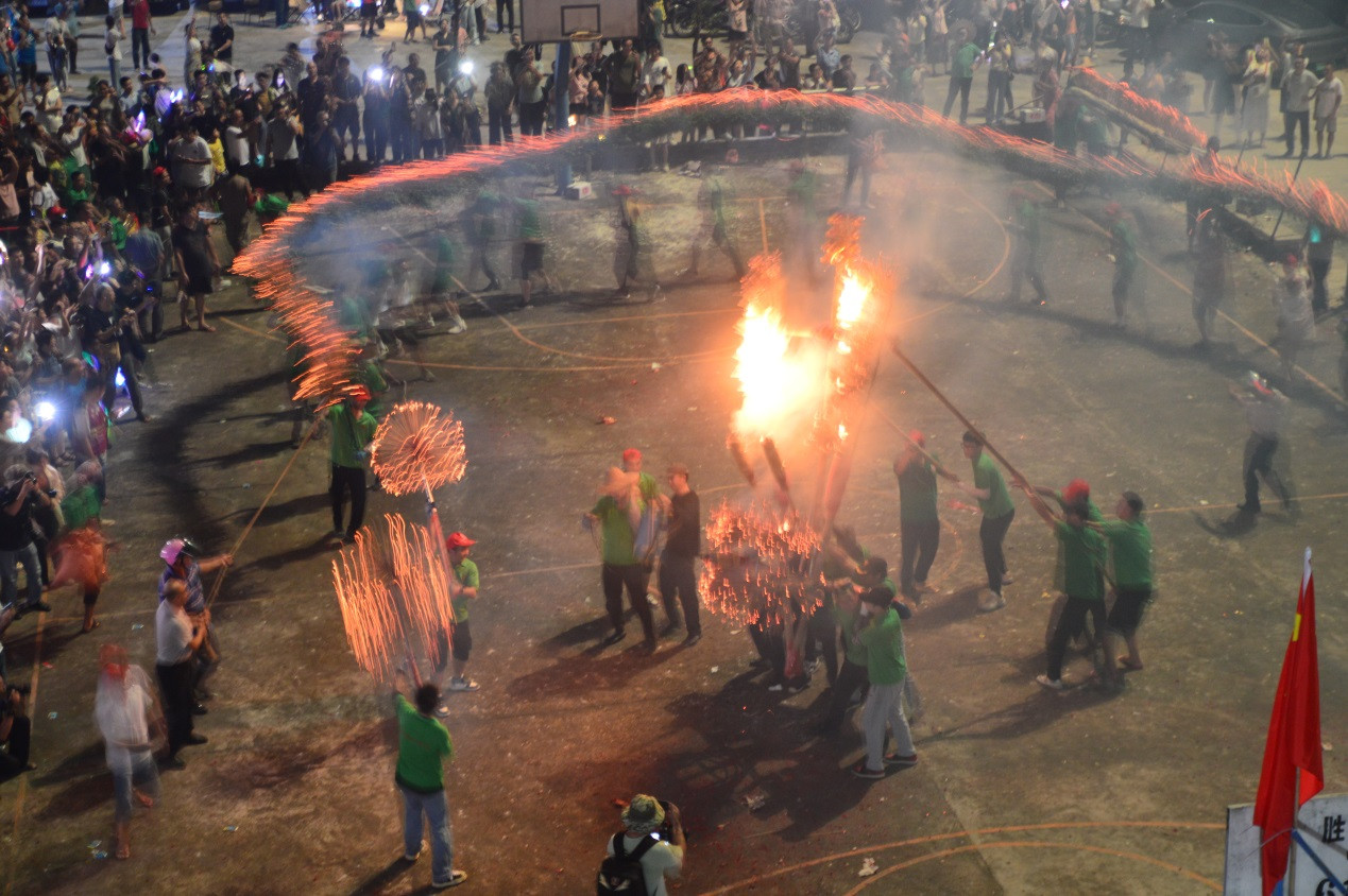 每年秋收农闲,男丁砍竹扎制丈余长的龙头龙尾(外包芭蕉皮便于插香),女眷编织草藤龙身;龙身分三十八节取吉祥之意,每节由一人执竿舞动,沉重龙头则需八名壮汉共抬。夜幕降临,村民齐聚五部堂焚香祭拜,争相将万支香插入龙身,称“沾龙气”,祈愿阖家平安。插香完毕,草龙化作火龙,在锣鼓声中游遍村巷。所到之处鞭炮齐鸣,火光翻飞如赤龙腾空。巡游毕,众人将龙浸入河中“放龙归海”,象征送走灾厄,继而全村共饮龙酒庆贺。