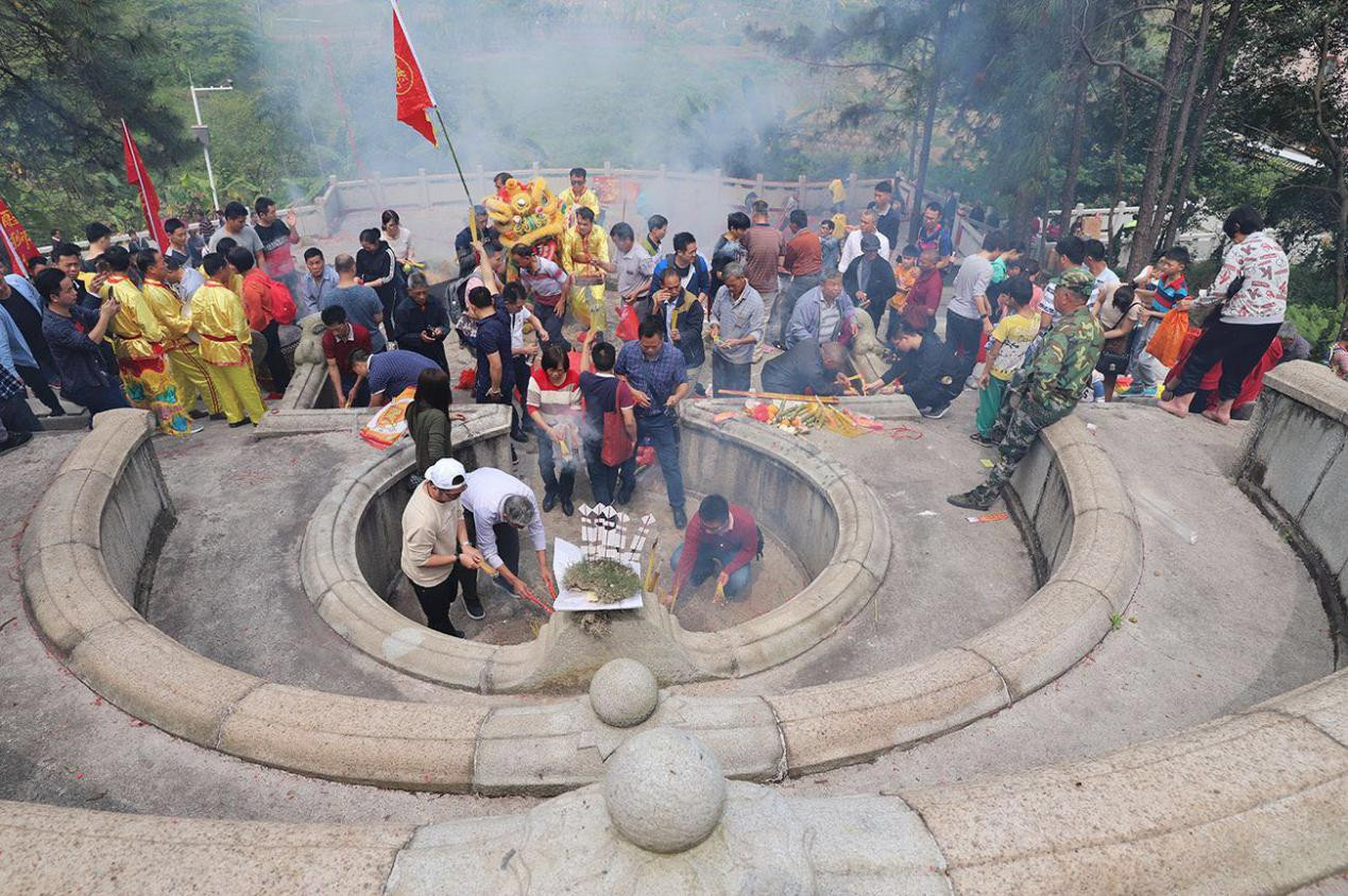 抢福运:花炮点燃后轰然升空,炮头四射,青壮年蜂拥争抢,抢中者高举炮头换神牌,寓意“接福气”;