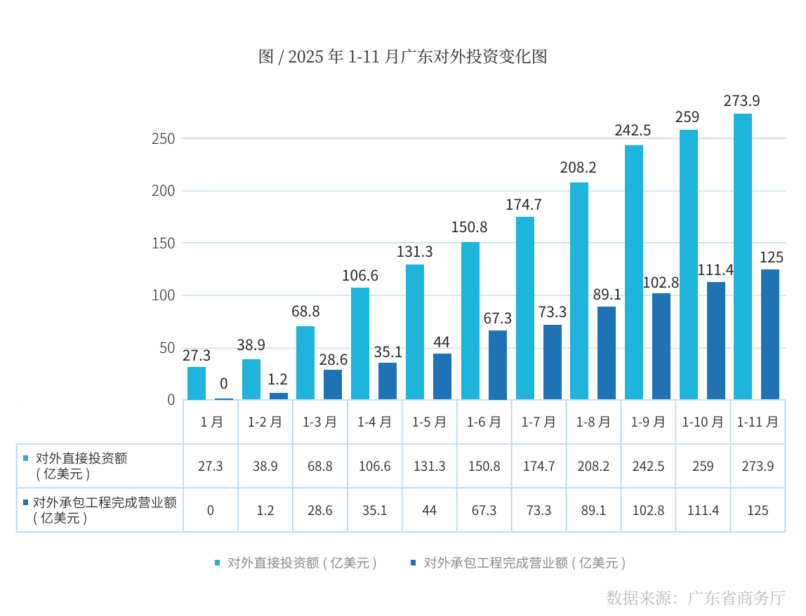 2025年1-11月,广东对外非金融类直接投资额273.9亿美元,占全国20.74%,同比增长为48%。对外承包工程完成营业额125亿美元,占全国8.16%。劳务和工程项下累计派出各类劳务人员42039人,期末在外各类劳务人员共计92468人。截至2025年10月末,广东共有125家企业集团开展本外币跨境资金池试点,集中外债及境外放款额度超4100亿美元。