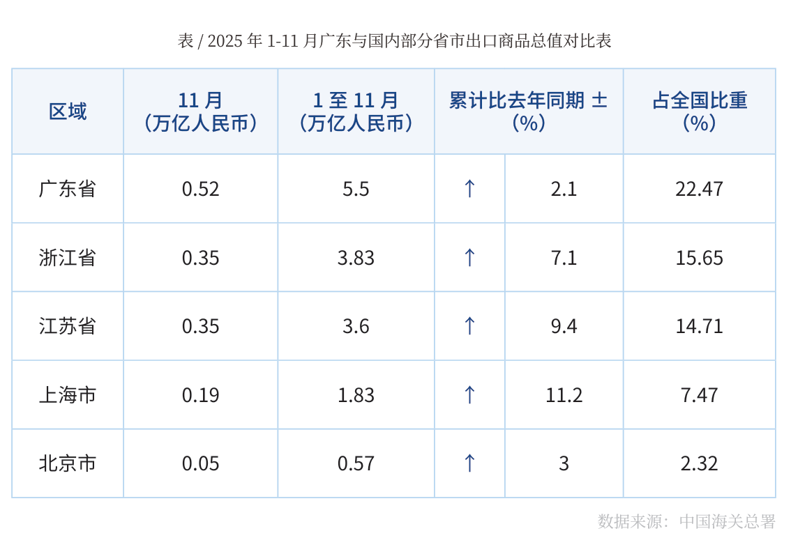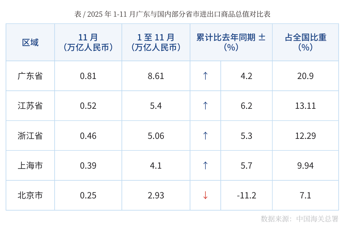 据海关总署统计,2025年前11个月,广东进出口总值达8.61万亿元,占全国20.9%,稳居首位,远超江苏(5.4万亿元)、浙江(5.06万亿元)、上海(4.1万亿元)和北京(2.93万亿元)。但从进出口增速看,江苏(6.2%)、上海(5.7%)、浙江(5.3%)均高于广东(4.2%)。
