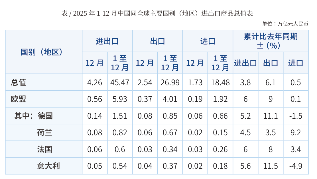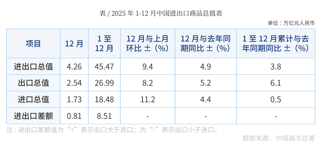 据海关总署统计,2025年,我国外贸进出口达45.47万亿元,增长3.8%。其中,出口26.99万亿元,增长6.1%;进口18.48万亿元,增长0.5%。具体来看,有以下特点: