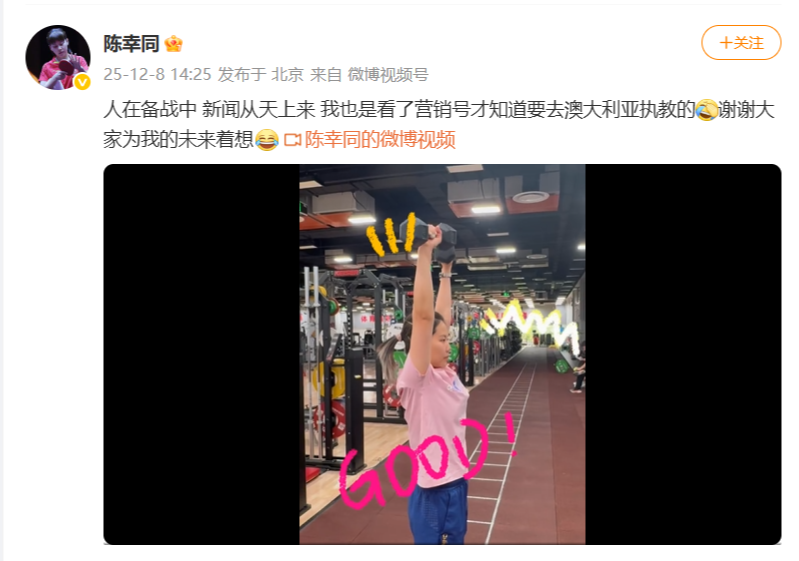 近日,网络上有自媒体账号发布消息称,现役国乒队员陈幸同即将出国担任澳大利亚国家青年队主教练。对此,陈幸同12月8日在个人微博发布动态幽默回应称:“人在备战中,新闻从天上来。我也是看了营销号才知道要去澳大利亚执教的,谢谢大家为我的未来着想。”