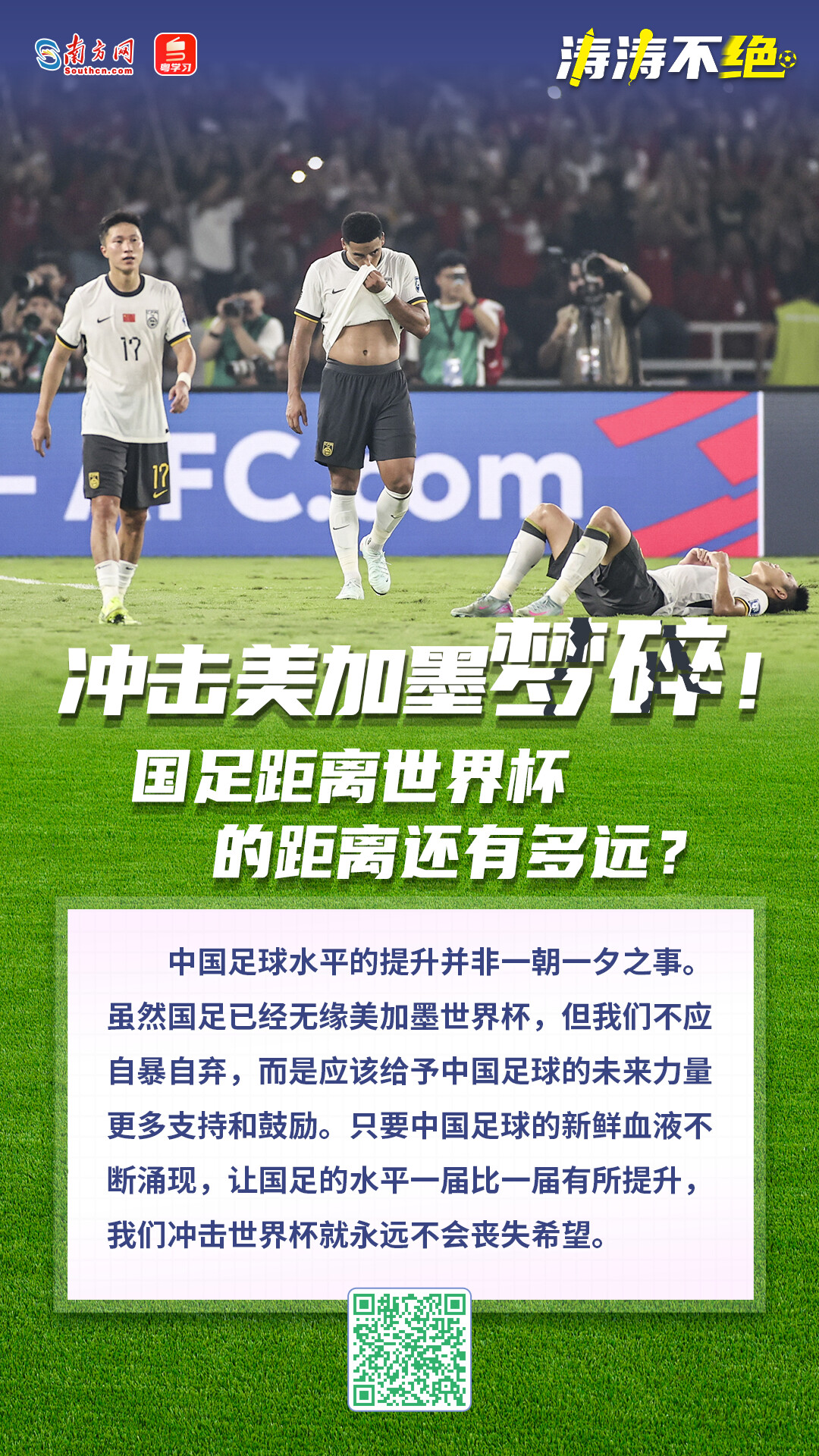 中国足球水平的提升并非一朝一夕之事。虽然国足已经无缘美加墨世界杯,但最后一场对巴林队的比赛,乃至下一个周期,我们都不应自暴自弃,而是应该给予中国足球的未来力量更多支持和鼓励,让他们在职业生涯的道路上顺利成长。只要中国足球的新鲜血液不断涌现,让国足的水平一届比一届有所提升,我们冲击世界杯就永远不会丧失希望。