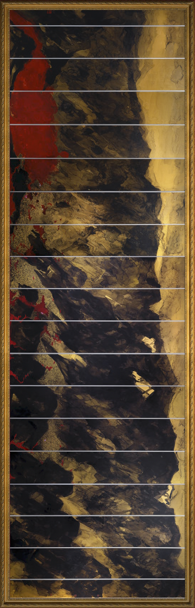 金笺作为一般用作庙堂之作的特殊材料,能够让水墨停留在表面上。画家利用金笺的特性,将岭南画派撞水的绘画技法发挥其中,让人们在纵览万壑千岩之时,与《苍山如海 残阳如血》的意境不期而遇。