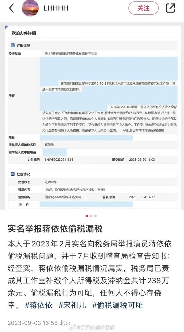 9月3日16:58,署名为“LHHHH”的小红书网友发布消息提到,自己于2023年2月实名向税务局举报演员蒋依依偷税漏税问题,并于(今年)7月收到稽查局检查告知书。