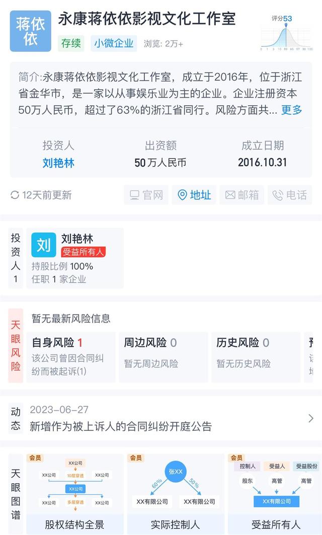 记者登录天眼查app发现,目前,永康蒋依依影视文化工作室经营状态依然为“存续”状态,其注册资本为50万人民币,投资人、受益人均为刘艳林。