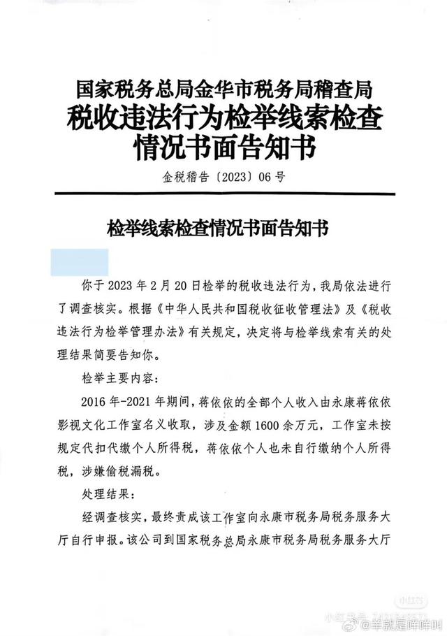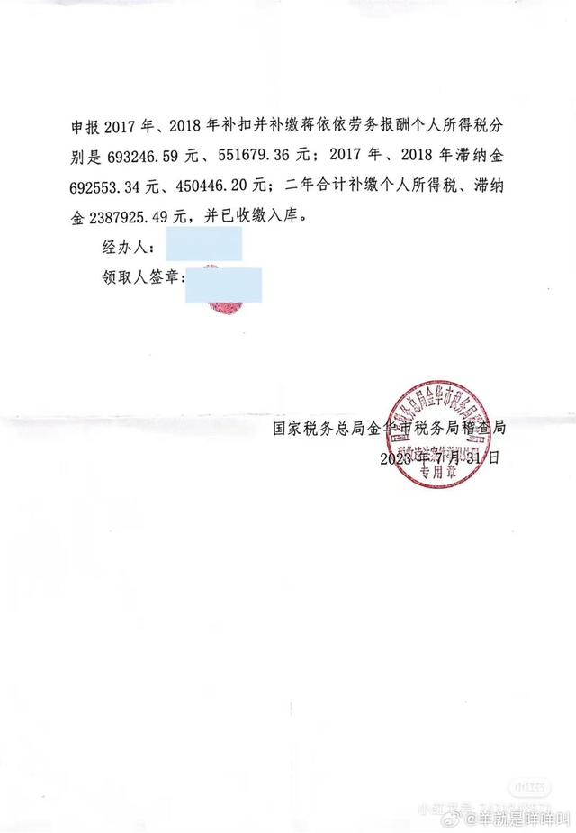 在举报页面之外,“LHHHH”还放出了金华市税务局于2023年7月31日回复给自己的《国家税务总局金华市税务局稽查局税收违法行为检举线索检查情况书面告知书》,告知书中确认了蒋依依个人存在偷税漏税违法情况,提到税务局在责成永康蒋依依影视文化工作室向永康市税务局税务服务大厅自行申报后,该公司申报2017、2018年补扣并补缴蒋依依劳务报酬个人所得税及滞纳金共计人民币2387925.49元,款项已收缴入库。