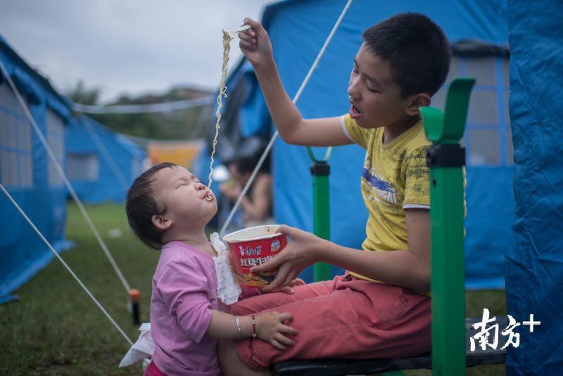 边上一个帐篷里,14岁的高杰和13岁的高聂彬两兄弟自抵达安置点后就没停下来过。他俩左手拿着矿泉水,右手拿着方便面,帮一家人领完物资后又跑去倒垃圾,照顾老人忙前忙后。当大家都在夸兄弟俩是家里的“顶梁柱”时,高聂彬指着高杰说:“我哥哥比我厉害,他还要照顾1岁9个月的妹妹,我们不能再给爸妈添乱了。”