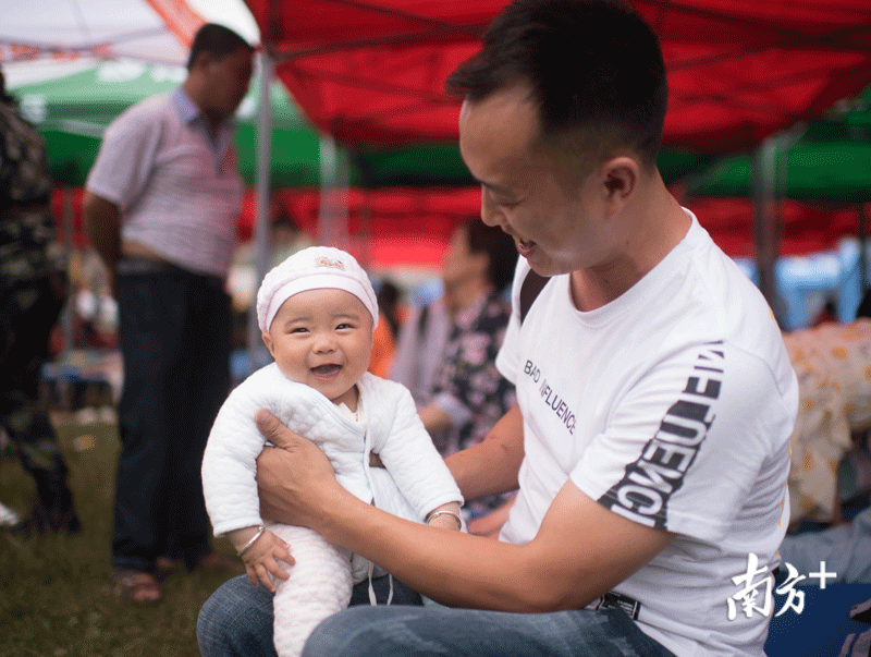 18日,在双河镇临时安置点,一个数月大的小朋友被爸爸逗乐了。南方日报记者 张梓望 董天健 摄