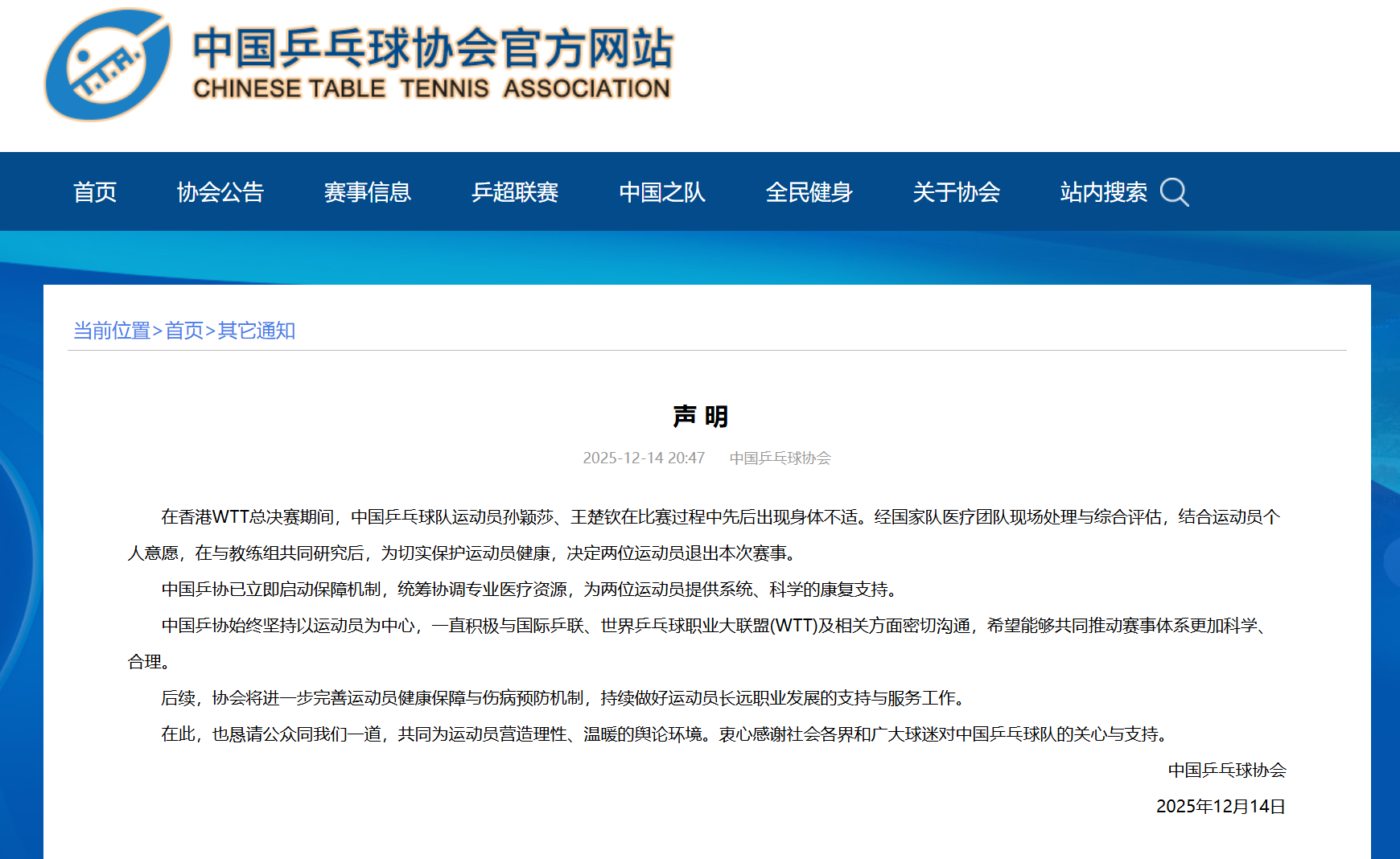 12月14日,中国乒乓球协会(简称“中国乒协”)发布声明,对国乒队员孙颖莎、王楚钦在世界乒乓球职业大联盟(WTT)香港总决赛期间因身体不适退赛作出回应。