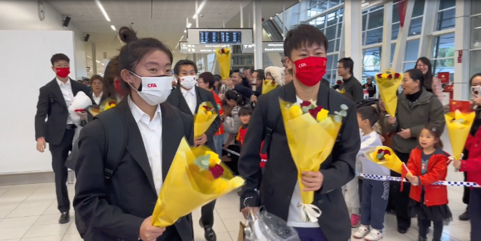 当天一早,正值冬季的阿德莱德下起了雨,增添一丝寒意。早7点左右,100多名当地民众等候在阿德莱德机场内,有的手捧鲜花,有的身穿中国队T恤,等待中国女足的到来。他们中一些人来自当地华人社团,其中不少家长带着小朋友一早赶来,还有的是球迷。