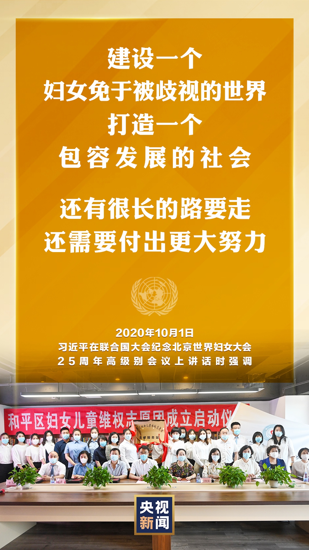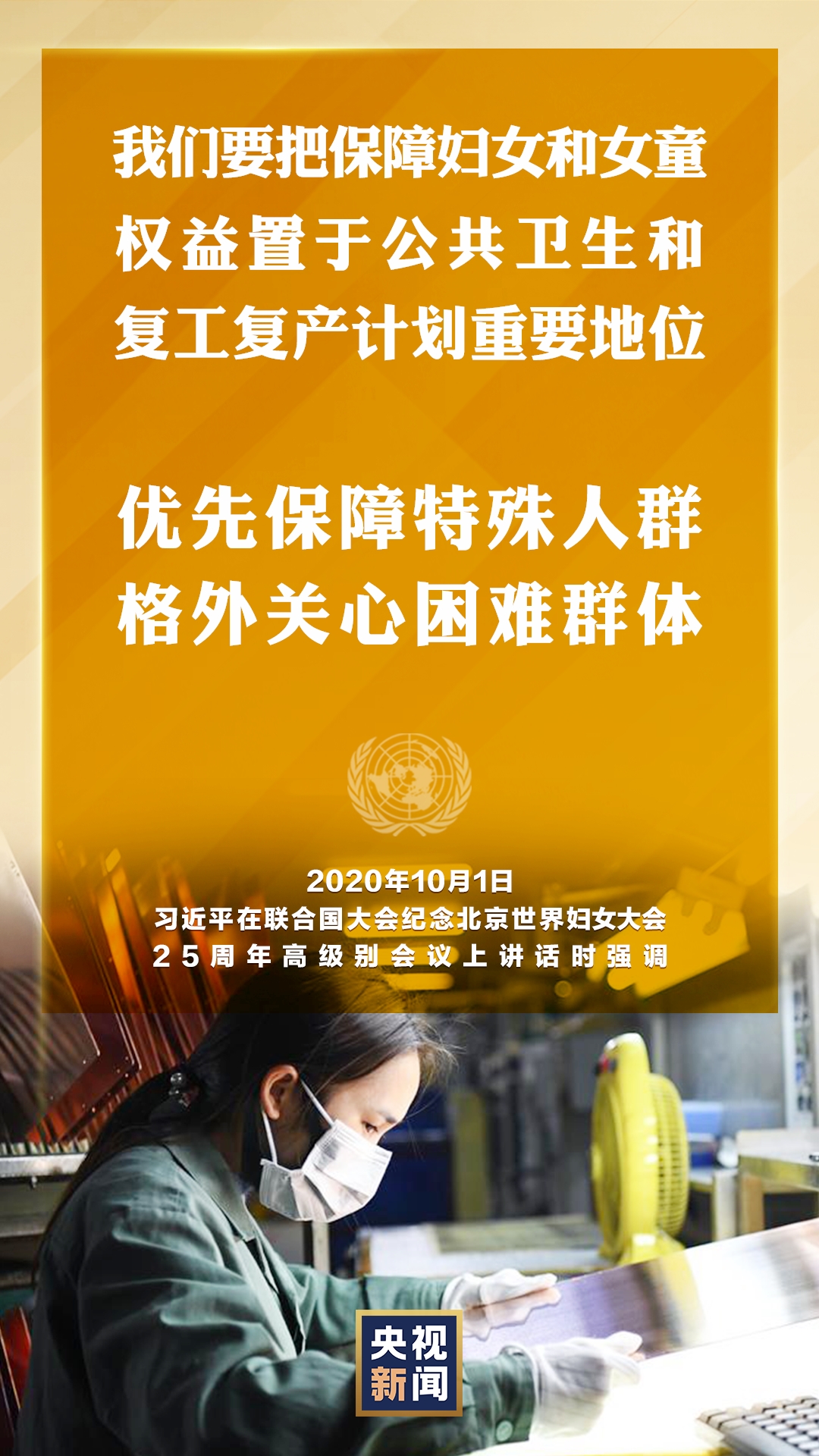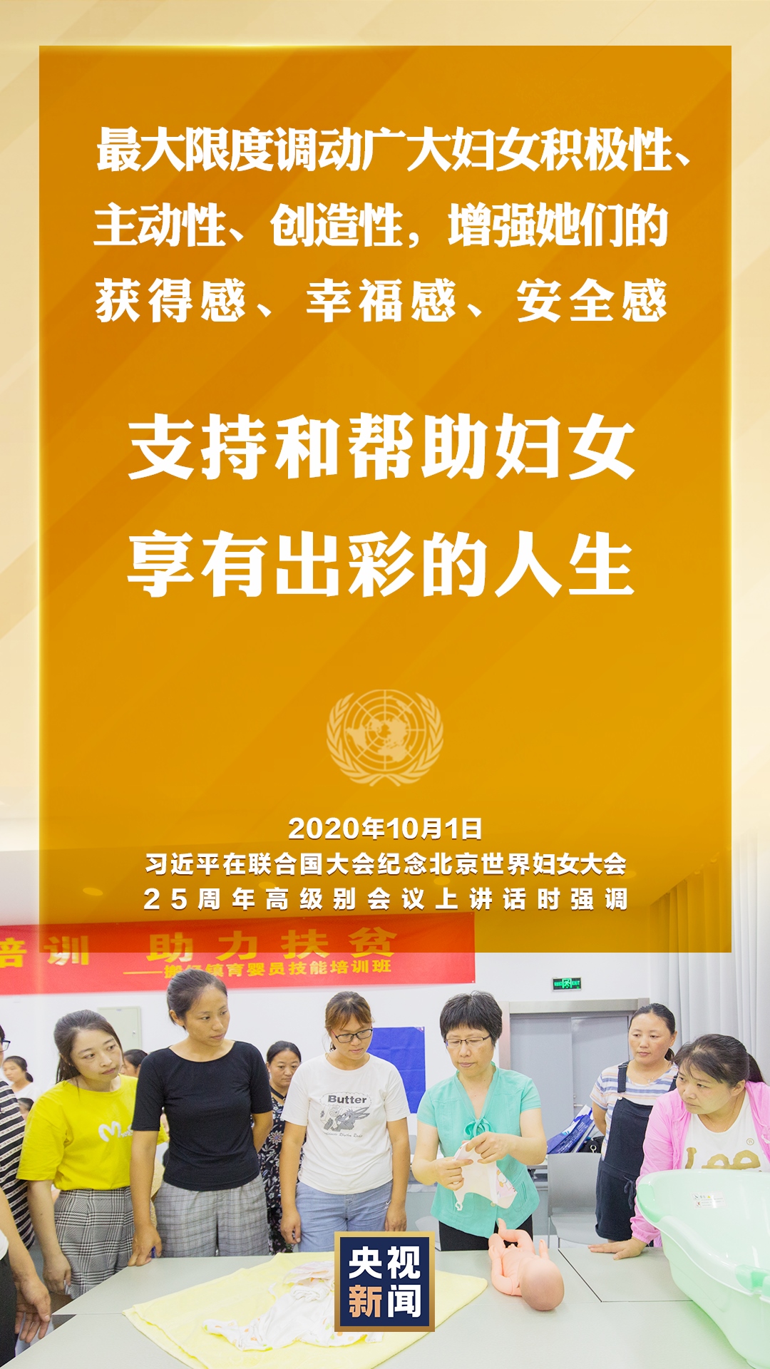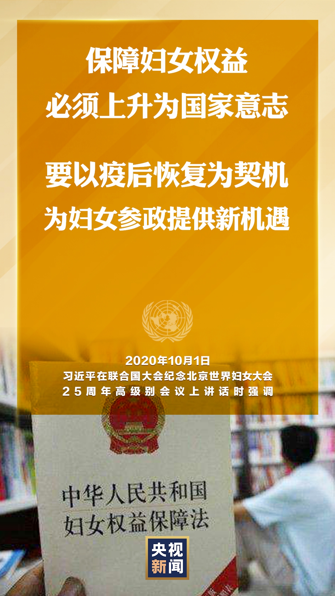 国家主席习近平10月1日在联合国大会纪念北京世界妇女大会25周年高级别会议上通过视频发表重要讲话。就如何切实保护妇女权益,习近平提出中国主张。