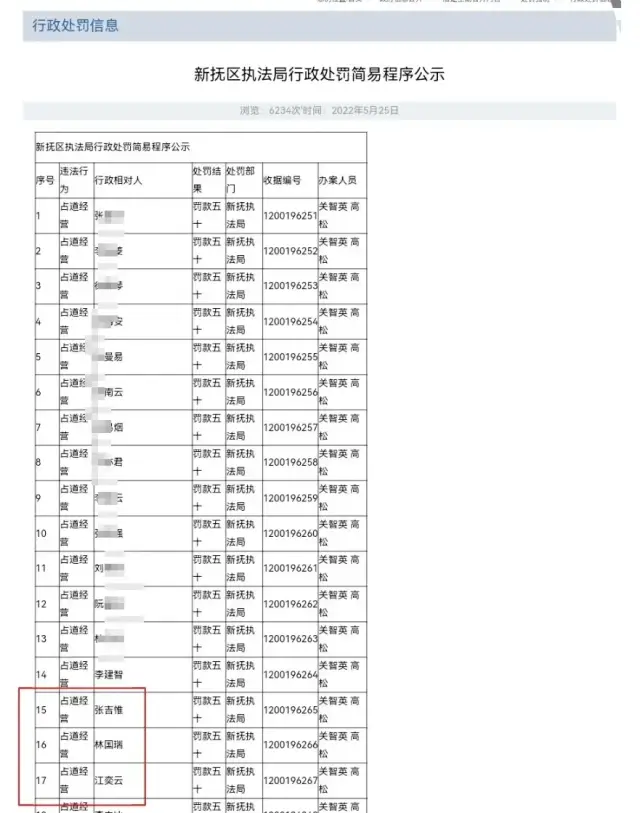 而“张吉惟、林国瑞、江奕云”这3个名字也出在其中,三人因占道经营被一人罚款50元。