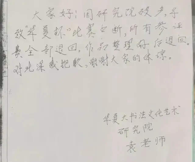 对获奖名单造假的原因,该工作人员一开始声称不太清楚,后又给记者发送了一张手写道歉信,落款为该研究院负责人袁老师。道歉信中提到,因研究院破产,导致“华夏杯”比赛中断,所有参评费全部退还,作品整理好后退回。