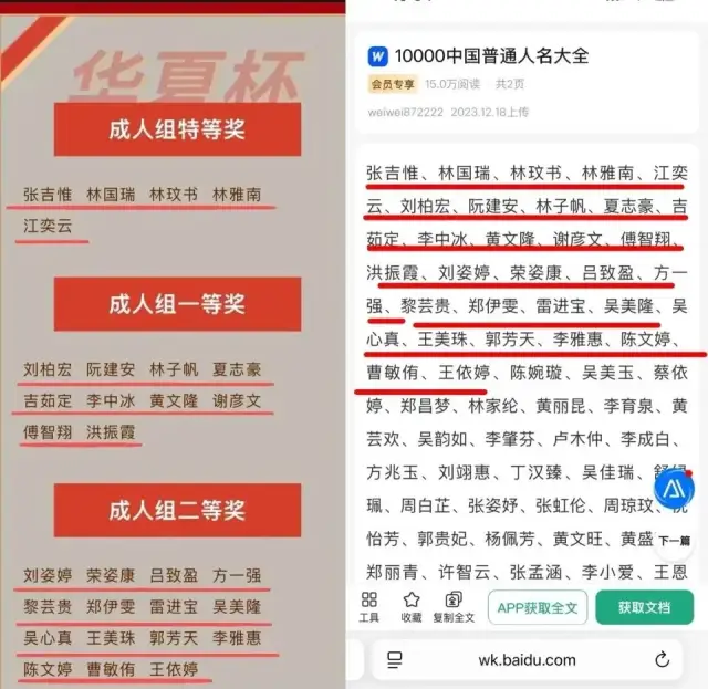 无独有偶,有网友反映在首届“华夏杯”全国书法大赛公示的获奖名单中,大量获奖者的名字也与百度文库中“10000中国普通人名大全”中的名字一致。