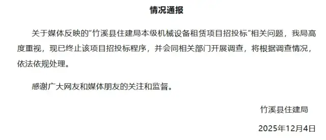 12月4日下午,竹溪县住建局发布情况通报:现已终止该项目招投标程序,并会同相关部门开展调查,将根据调查情况,依法依规处理。