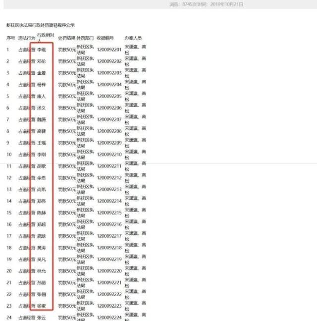 12月4日,更是有网友发现辽宁抚顺新抚区住房和城乡建设局于2019年10月21日公示的一占道经营处罚名单疑存猫腻,名单上的名字不但均为“姓氏+单名”的两字结构,而且还不少与知名艺人重名,如鹿晗、孙俪、李现、金晨、董璇等。