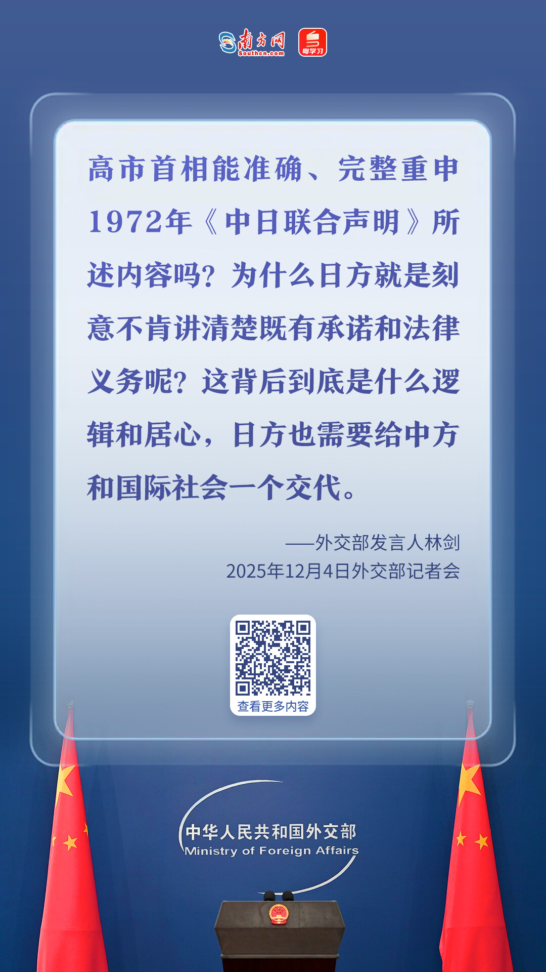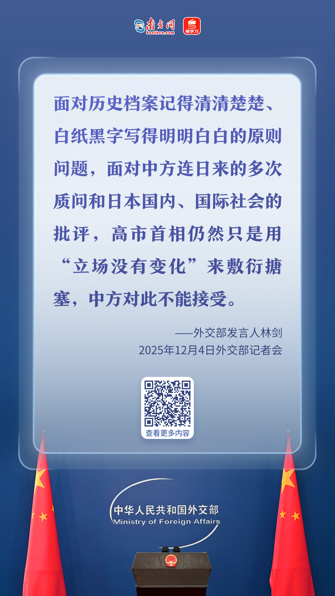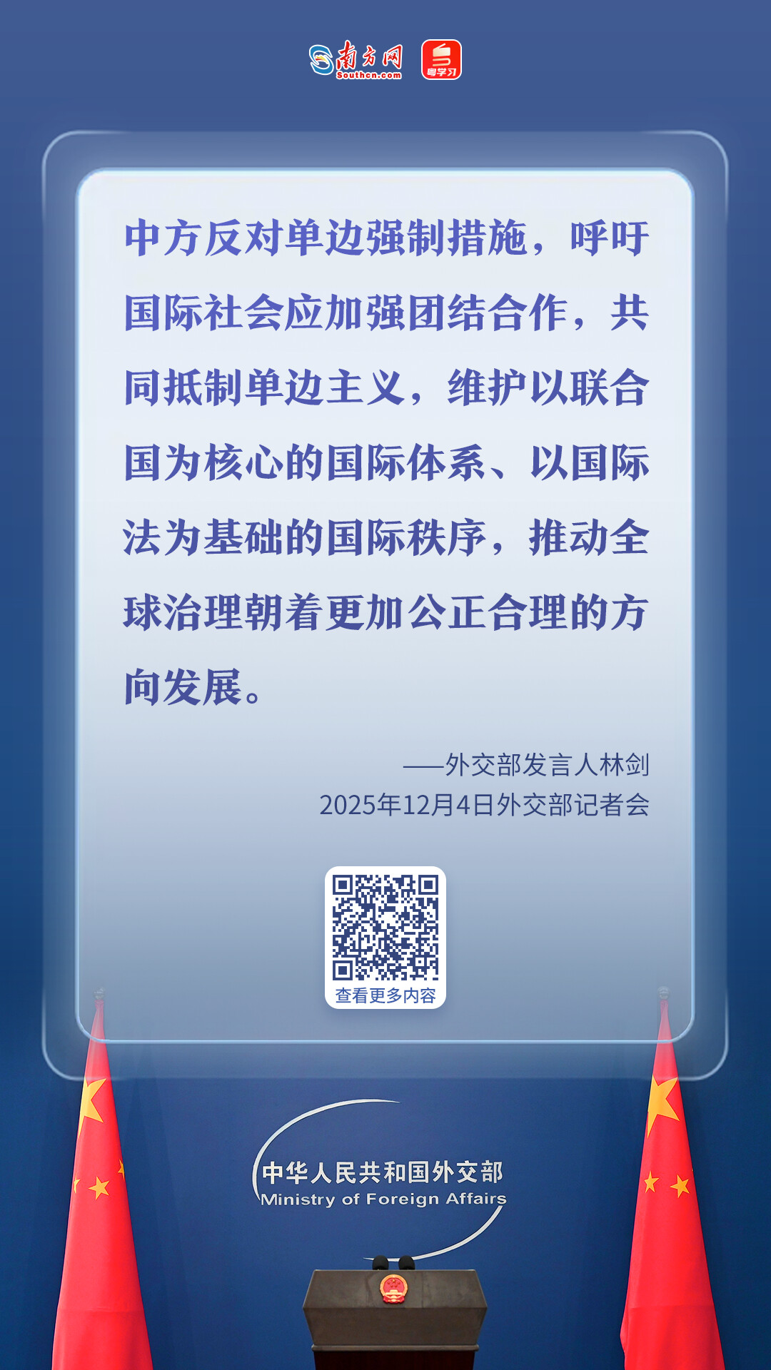 12月4日,外交部发言人林剑主持例行记者会,就高市早苗再次表示对台“立场未变”、反对单边强制措施国际日、多国频繁采用单边措施等问题回答记者提问(查看实录>>>)。一组图片带你速览今日外交部记者会要点。