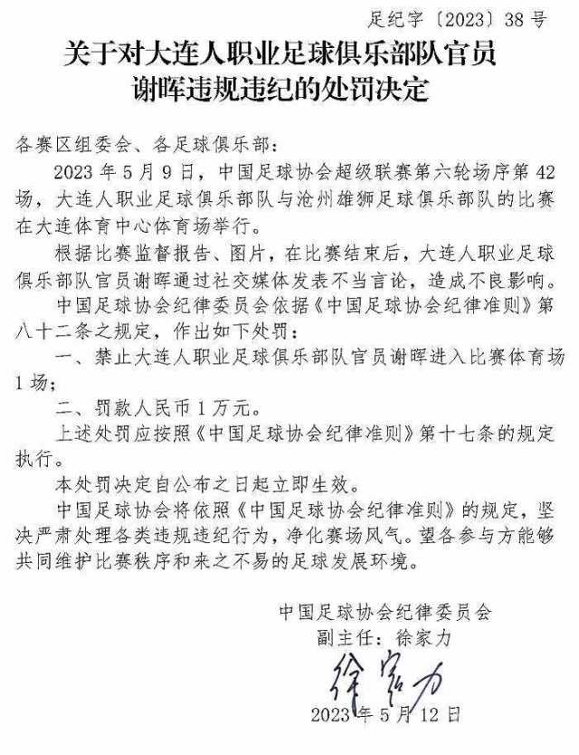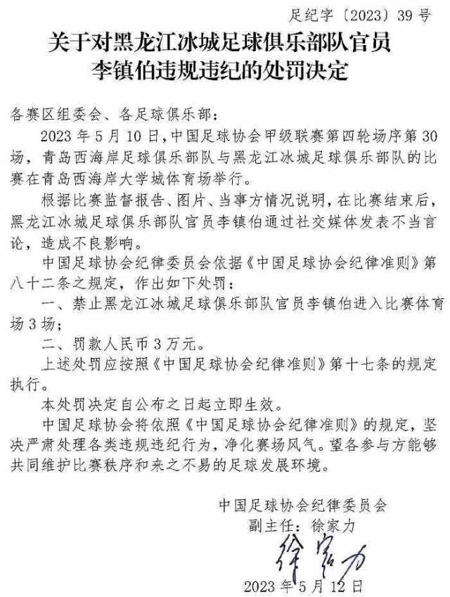 5月12日,中国足球协会官网发布3则对俱乐部官员违规违纪的处罚决定。处罚决定显示,因在比赛结束后通过社交媒体发表不当言论,造成不良影响,黑龙江冰城足球俱乐部队官员李镇伯被禁止进入比赛体育场3场、罚款3万元,大连人职业足球俱乐部队官员谢晖、南通支云足球俱乐部队官员花兵分别被禁止进入比赛体育场1场、罚款1万元。
