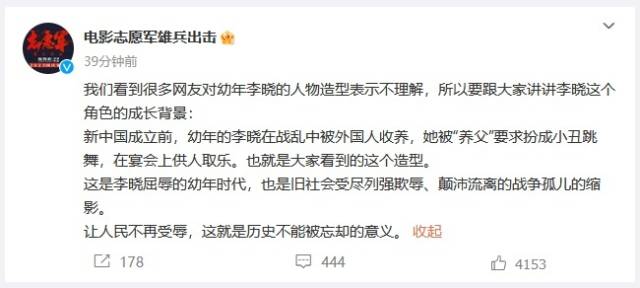 17日,@电影志愿军雄兵出击 回应称,我们看到很多网友对幼年李晓的人物造型表示不理解,所以要跟大家讲讲李晓这个角色的成长背景:新中国成立前,幼年的李晓在战乱中被外国人收养,她被“养父”要求扮成小丑跳舞,在宴会上供人取乐。也就是大家看到的这个造型。这是李晓屈辱的幼年时代,也是旧社会受尽列强欺辱、颠沛流离的战争孤儿的缩影。