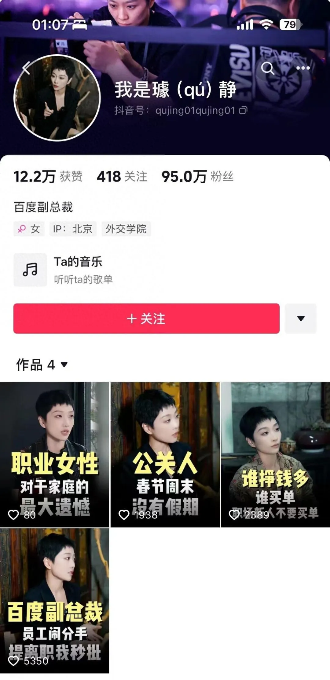 日前,璩静在个人抖音号上发布多条视频引发争议,多个相关话题词条登上微博热搜。