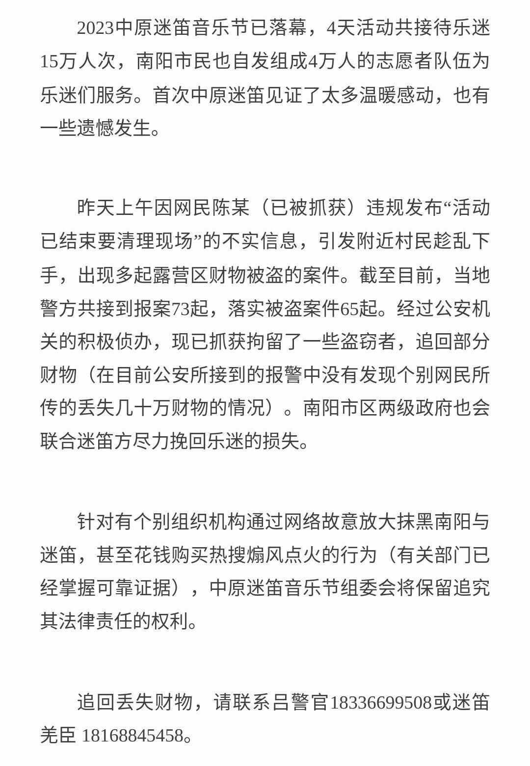 10月5日上午,迷笛音乐节官方微博@迷笛 发布有关中原迷笛的重要公告:昨天上午因网民陈某(已被抓获)违规发布“活动已结束要清理现场”的不实信息,引发附近村民趁乱下手,出现多起露营区财物被盗的案件。截至目前,当地警方共接到报案73起,落实被盗案件65起。经过公安机关的积极侦办,现已抓获拘留了一些盗窃者,追回部分财物(在目前公安所接到的报警中没有发现个别网民所传的丢失几十万财物的情况)。