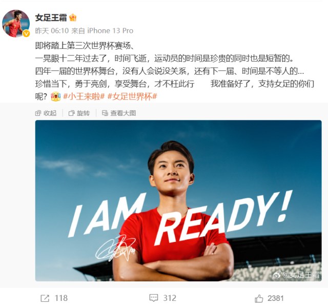 王霜在行前也更新了自己的社交媒体,这将是她的第三次女足世界杯之旅。“四年一届的世界杯舞台,没有人会说没关系,还有下一届、时间是不等人的……珍惜当下,勇于亮剑,享受舞台,才不枉此行”,她这样写道。