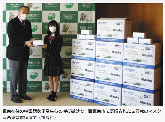 近日,日本西东京市政府官网发布消息称,4月22日,该市收到一名中国籍女高中生捐赠的2万个一次性医用口罩。消息称,这名女高中生住在日本西东京市。在学校的朋友等帮助下,她通过网络募集资金,并受到市内企业的支援,得以完成此次捐赠活动。