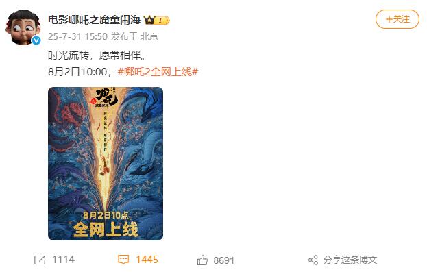 据@电影哪吒之魔童闹海 今天(31日)消息,《哪吒之魔童闹海》定档8月2日全网上线。