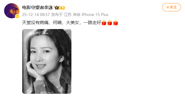 “电影守望者余泳”向记者证实了这一消息,他于社交平台发布何晴的黑白肖像照,并配文“天堂没有病痛,何晴,大美女,一路走好”,引发网友与演艺圈人士的集体缅怀。余泳透露,何晴生病后一直希望低调,让大家永远记住她美好的形象。