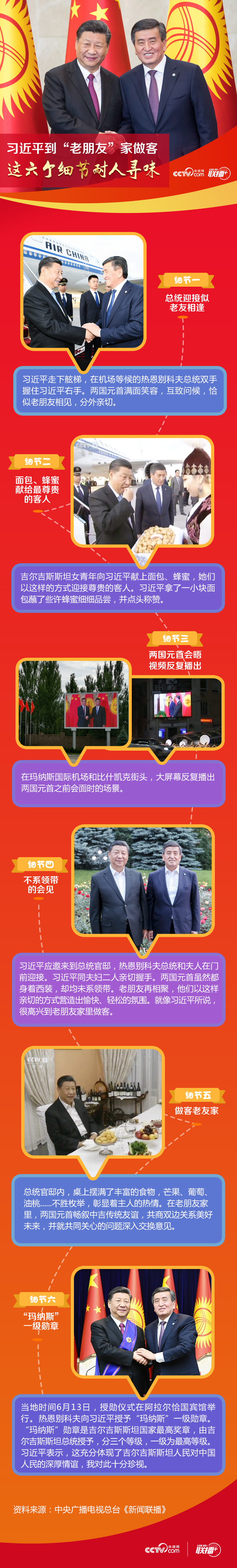 习近平时隔六年再访吉尔吉斯斯坦,从受到热恩别科夫热情迎接,到赴总统官邸做客,再到获授“玛纳斯”一级勋章……一系列高规格外交礼遇,再次彰显了两国元首之间的深厚情谊,印证了中吉两国的世代友好关系。