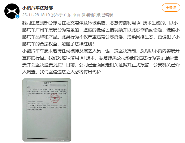 11月28日,@小鹏汽车法务部 发文称,注意到部分账号在社交媒体及私域渠道,恶意传播利用AI技术生成的、以小鹏汽车广州车展展台为背景的,虚假的低俗色情视频并以此炒作负面话题、诋毁小鹏汽车品牌和产品。此类行为不仅严重违背公序良俗,污染网络生态,更侵犯了小鹏汽车的合法权益,触碰了法律红线。小鹏汽车方面当日表示,公司已全面固定相关证据并正式报警,公安机关已介入调查。