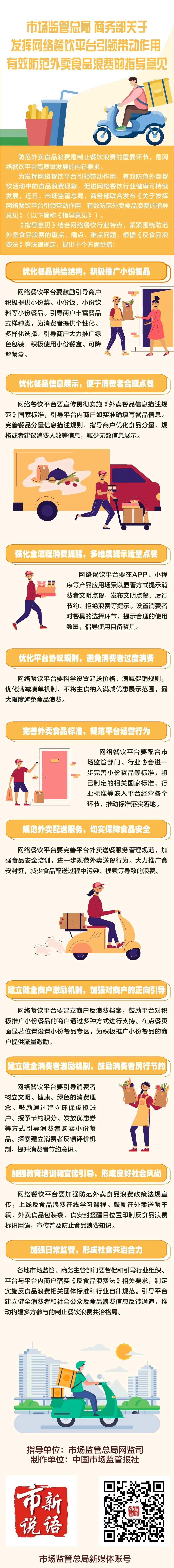 市场监管总局、商务部近日联合印发《关于发挥网络餐饮平台引领带动作用 有效防范外卖食品浪费的指导意见》,引导平台进一步优化协议规则,完善凑单满减机制,鼓励平台建立商户反浪费档案,引导商户设置小份餐品专区,使用绿色包装,并通过首页显著位置展示、流量扶持等方式加强对商户正向引导。引导平台进一步优化餐品供给结构,优化餐品信息展示,积极推广小份餐品,强化全流程文明点餐提醒,建立健全消费者节约激励机制。鼓励平台加强防范外卖食品浪费政策法规宣传解读,各级市场监管、商务主管部门强化对平台企业的日常监管和行政指导,推动构建多方参与的防范外卖食品浪费共治格局。
