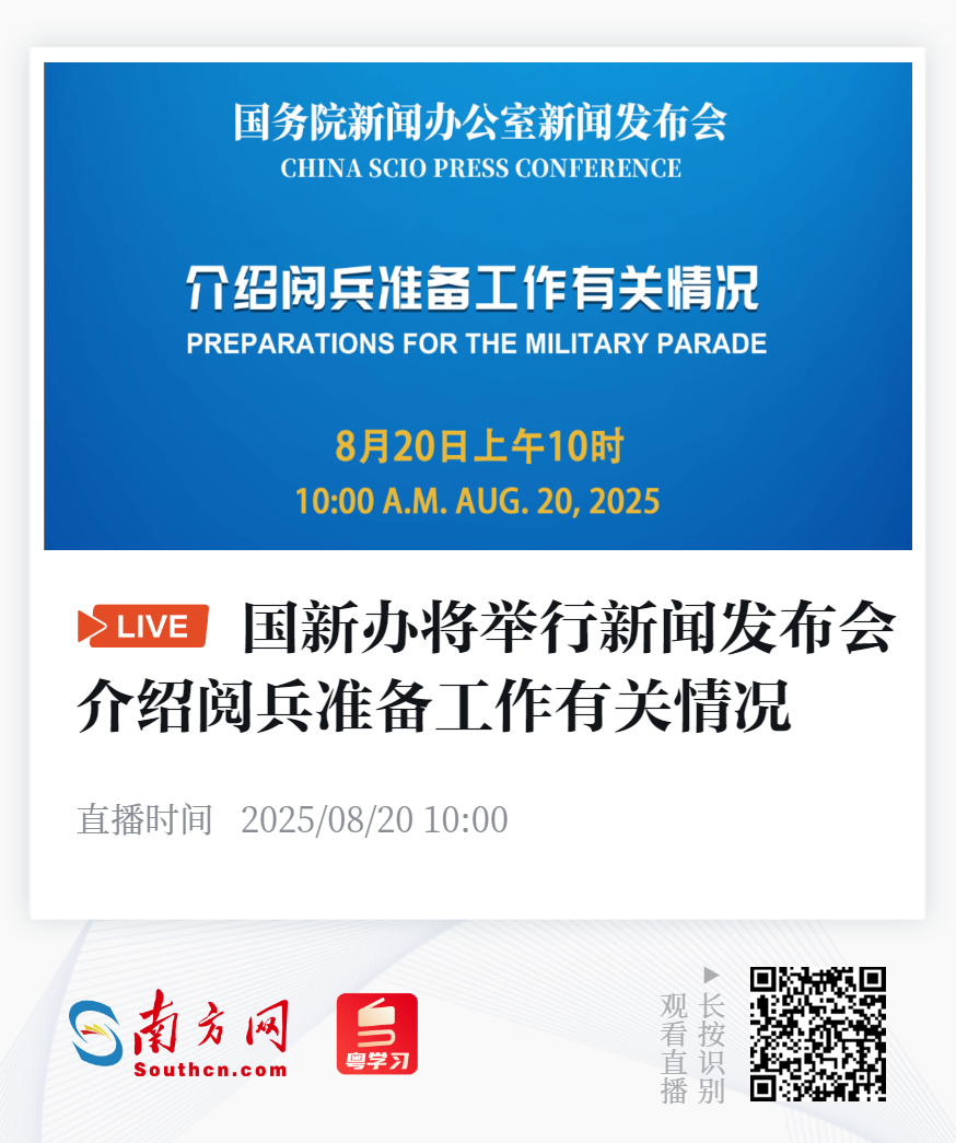 国务院新闻办公室定于2025年8月20日(星期三)上午10时举行新闻发布会,阅兵领导小组办公室副主任、中央军委联合参谋部作战局少将副局长吴泽棵,中国人民解放军中部战区阅兵指挥机构办公室常务副主任、政治工作部少将副主任徐贵忠介绍阅兵准备工作有关情况,并答记者问。