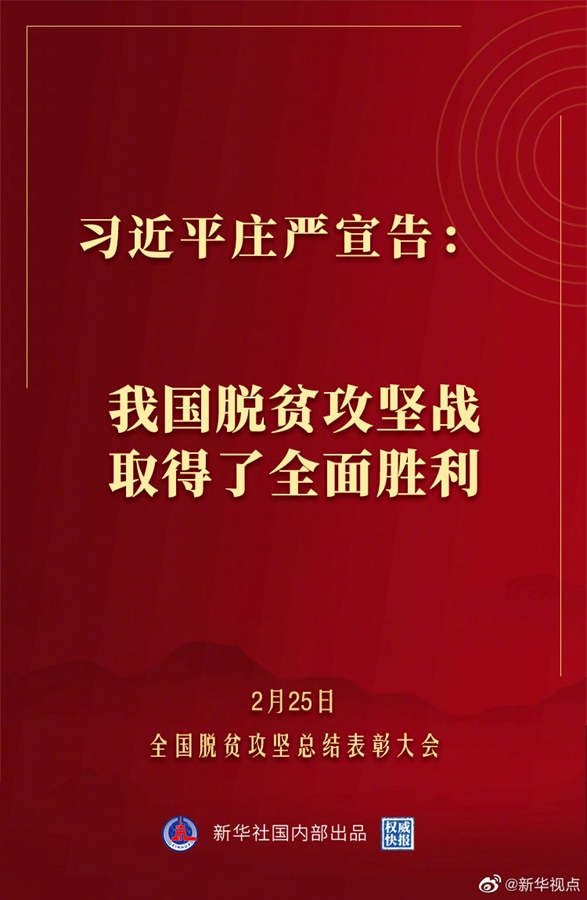 习近平在全国脱贫攻坚总结表彰大会上发表重要讲话,庄严宣告,经过全党全国各族人民共同努力,在迎来中国共产党成立一百周年的重要时刻,我国脱贫攻坚战取得了全面胜利,现行标准下9899万农村贫困人口全部脱贫,832个贫困县全部摘帽,12.8万个贫困村全部出列,区域性整体贫困得到解决,完成了消除绝对贫困的艰巨任务,创造了又一个彪炳史册的人间奇迹!这是中国人民的伟大光荣,是中国共产党的伟大光荣,是中华民族的伟大光荣!